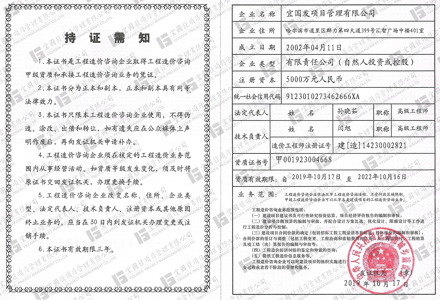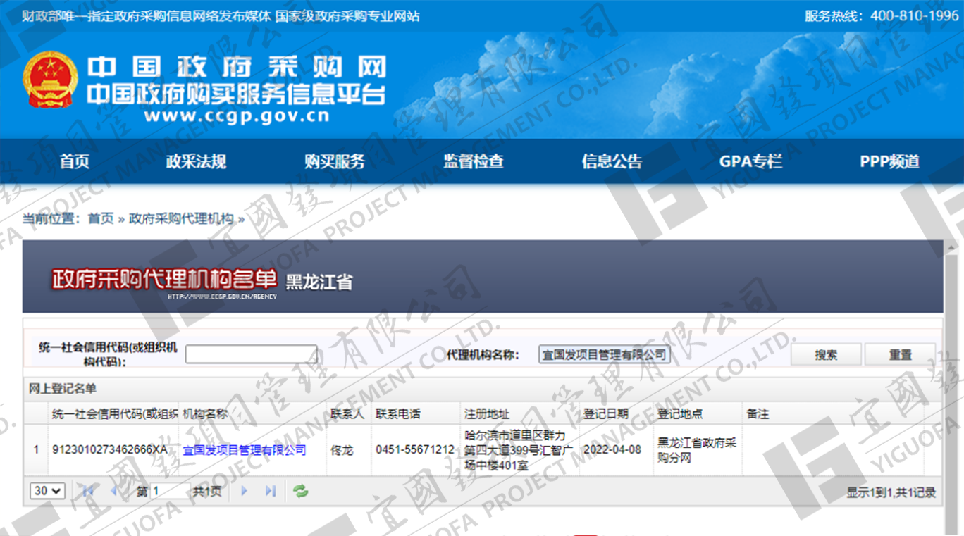 宜國(guó)發(fā)項(xiàng)目管理有限公司(原名黑龍江國(guó)發(fā)項(xiàng)目管理有限責(zé)任公司)成立于2002年4月,公司注冊(cè)資金5000萬(wàn)元人民幣,具有獨(dú)立法人資格?,F(xiàn)具備國(guó)家住房和城鄉(xiāng)建設(shè)部頒發(fā)的工程招標(biāo)代理機(jī)構(gòu)甲級(jí)資質(zhì),發(fā)展和改革委員會(huì)頒發(fā)的中央投資項(xiàng)目招標(biāo)代理機(jī)構(gòu)甲級(jí)資質(zhì)、財(cái)政部頒發(fā)的政府采購(gòu)代理機(jī)構(gòu)甲級(jí)資質(zhì),黑龍江省住房和城鄉(xiāng)建設(shè)廳頒發(fā)的工程造價(jià)咨詢(xún)企業(yè)甲級(jí)資質(zhì),并已納入全國(guó)投資項(xiàng)目在線(xiàn)審批監(jiān)管平臺(tái)工程咨詢(xún)單位備案名單、“中國(guó)政府采購(gòu)網(wǎng)”政府采購(gòu)代理機(jī)構(gòu)名單及“中國(guó)國(guó)際招標(biāo)網(wǎng)”機(jī)電產(chǎn)品國(guó)際招標(biāo)代理機(jī)構(gòu)名單,且通過(guò)了質(zhì)量管理體系、環(huán)境管理體系、職業(yè)健康安全管理體系認(rèn)證。